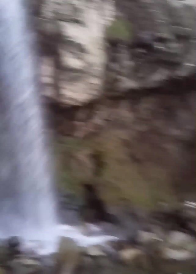waterfall cascading over a rocky cliff. The camera then moves upward, showing the surrounding forest. The trees are mostly bare, and the sky is overcast. Two people are walking on a path through the woods. The camera is handheld and shakes quite a bit.