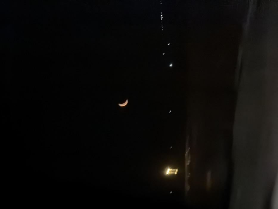 The image displays a nocturnal scene in Cetate, Romania. A distinct orange-red crescent moon is positioned against a dark sky in the upper-right quadrant. The lower third of the frame consists of a dark, indistinct ground surface, consistent with snow cover under minimal ambient light. A solitary, prominent, rectangular yellow-orange artificial light source, likely a streetlamp, is present on the left side of the mid-ground. Horizonally across the distant mid-ground, a cluster of small, white artificial lights indicates a remote settlement or roadway, with several additional isolated faint lights scattered in between. No human figures, animals, or dynamic actions are observable within the frame.