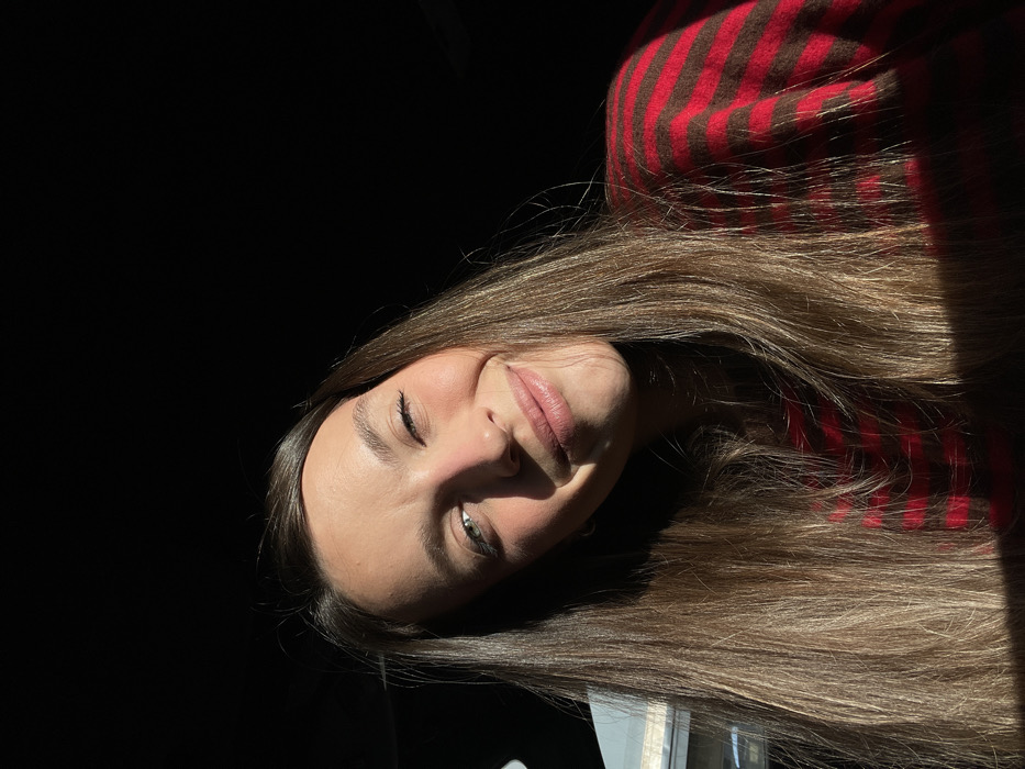 A portrait-oriented image shows a young adult female from the chest up, positioned slightly to the left of the frame's vertical center. She has long, straight, brown hair with lighter highlights, cascading over her shoulders and part of her chest. The subject is wearing a garment with horizontal stripes of red and dark brown. Her facial expression is a slight smile, with her eyes appearing narrowed, facing directly towards the viewer. Intense natural light, likely sunlight, originates from the left side of the frame, brightly illuminating the left side of her face, hair, and the visible portion of her attire. This light creates a sharp shadow line bisecting her face, leaving the right side of her face and the majority of the background in deep shadow, appearing almost black. A minimal, out-of-focus lighter area is discernable at the extreme left edge of the background. The scene is located in Stanišići, Montenegro.