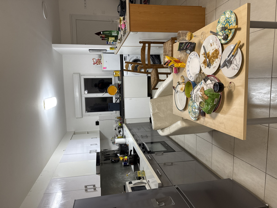 A cluttered kitchen scene shows dirty dishes on a wooden table, including plates, glasses, and cutlery. The table is surrounded by chairs, including a tan leather chair. The kitchen has modern cabinets, a dark countertop, and stainless steel appliances. A window provides natural light, and a bright overhead light illuminates the room. A washing machine is visible near the back, with various items stored above.