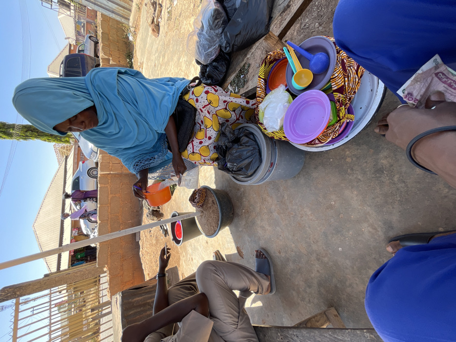 The image depicts an outdoor market scene in Jos, Nigeria, under a clear, sunny sky. In the foreground, a woman, dressed in a light blue headscarf and shawl over a yellow, white, and red patterned skirt, sits on a low stool. She is engaged in a transaction, using an orange plastic scoop to transfer a white granular substance from a pile in a large black bucket into a small, clear plastic bag. A black purse hangs from her left shoulder. To her immediate right, a stack of grey plastic buckets is visible, with items in black plastic bags resting on them. Adjacent to these buckets, a woven basket contains an assortment of colorful plastic plates (purple, orange, grey) and plastic scoops (yellow, blue, green) for sale. A white pole, possibly supporting a makeshift shelter, is anchored in the bucket containing the granular material. To the left of the central woman, a male customer is partially visible, seated with his back towards the camera. He wears light brown trousers and grey slide sandals. His right hand rests on his knee. At the bottom of the frame, the perspective of another individual (the photographer) is shown, wearing blue trousers, with bare feet or feet in sandals, holding a 200 Nigerian Naira banknote. The ground is dry, appearing to be a mix of dirt and unpaved concrete. In the background, behind a low brick wall, a street is visible with a silver sedan and a dark SUV. Two other women are seen walking or standing on the street near the vehicles. Several buildings with corrugated metal roofs line the street under the bright, blue sky, indicating a typical urban or semi-urban market environment.