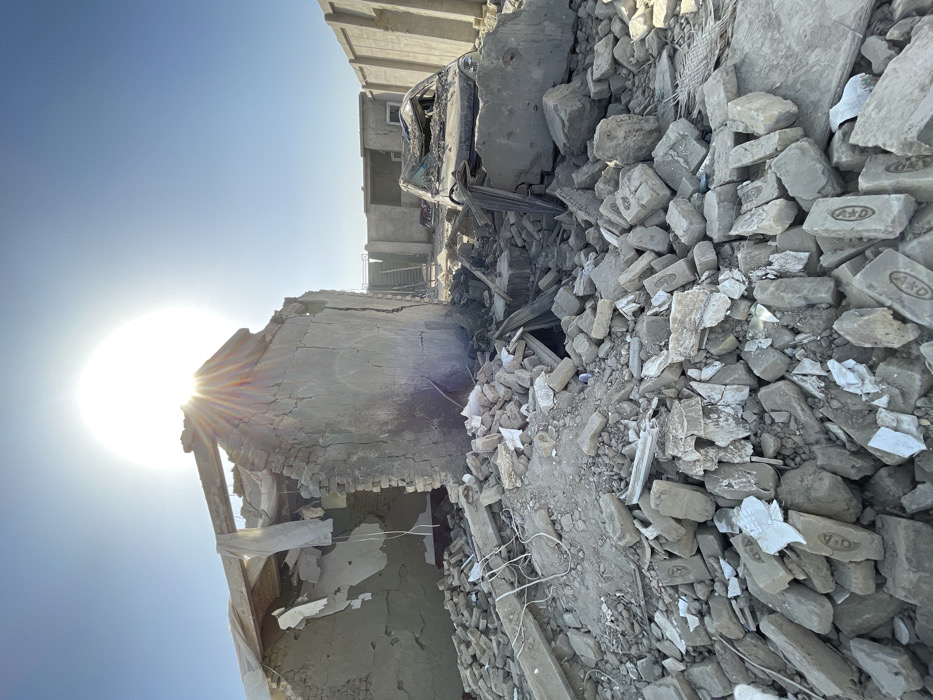 The image displays an extensively damaged urban landscape in Spin Boldak, Afghanistan, under a clear, bright blue sky with a prominent sunburst effect from the high sun. The foreground is filled with a dense accumulation of grey and tan rubble, consisting primarily of fragmented bricks (some marked 'A*D'), broken concrete, and other structural debris, interspersed with pieces of white shredded material. To the left, a partially collapsed masonry building stands, its remaining walls exhibiting cracks, with a portion of its roof missing, revealing exposed wooden beams and draped white sheeting. To the right of this structure, a severely damaged, dark-colored vehicle, resembling a sedan, is observed amidst the rubble; its roof is either caved in or completely absent, and its interior appears compromised and filled with debris. In the background, additional damaged or incomplete structures are visible, along with a tall concrete boundary wall on the far right and a metal staircase ascending in the mid-right portion of the frame. The overall scene appears arid and dusty. No individuals are visible.