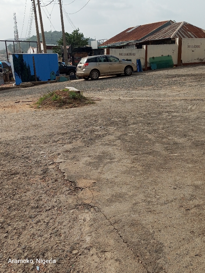 cracked, gray asphalt road in the city of Ado Ekiti, Nigeria. It is taken at a slight downward angle. A silver SUV is parked near the edge of the road and is facing the opposite direction of the camera. The vehicle is parked near a building with a red roof. The building appears to be made of concrete with a brown painted wall. A sign on the wall says "No Smoking". There is a large blue structure behind the vehicle and there is a green structure to the right of the vehicle. There is a small pile of dirt and grass in the foreground. There are several electrical poles and power lines in the background. The image appears to have been taken from a person standing on the road. The image is slightly blurry.