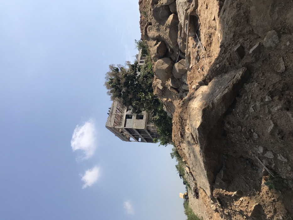 The image depicts a construction site in Abuja, Nigeria, characterized by rugged, elevated terrain under a clear blue sky. In the foreground, a steep slope of reddish-brown earth is covered with numerous large and small boulders and exposed rock formations. In the midground, a multi-story concrete building, appearing to be at least five levels tall, is under active construction. The structure features exposed concrete frames and partially completed infill walls constructed from concrete blocks. The uppermost level exhibits extensive wooden formwork and scaffolding, indicating ongoing work on the roof or top floor. Multiple dark figures, presumed to be construction workers, are visible on this top level. A large green tree with visible blossoms stands to the right of the building, partially obscuring its lower sections. Further left in the background, on a graded dirt path or leveled area atop another rise, a single piece of yellow heavy construction equipment, possibly an excavator or bulldozer, is visible. The sky is a bright, clear blue with two small, isolated white clouds. The scene is illuminated by strong daylight, casting minimal shadows directly beneath objects.