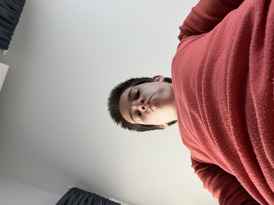 A young male is depicted in a low-angle, head-and-shoulders shot, looking directly into the camera. He has short, dark hair and his lips are puckered into a "fish face" expression. He is wearing a long-sleeved, coral-red sweater with visible pilling on the fabric. The background is a plain, light grey wall. Partially visible dark blue or black pleated curtains or blinds are present in the upper left and right corners of the frame, indicating an indoor setting. No specific geographical markers identifying the location as Sofia, Bulgaria, or any particular city, are present within the visual information.