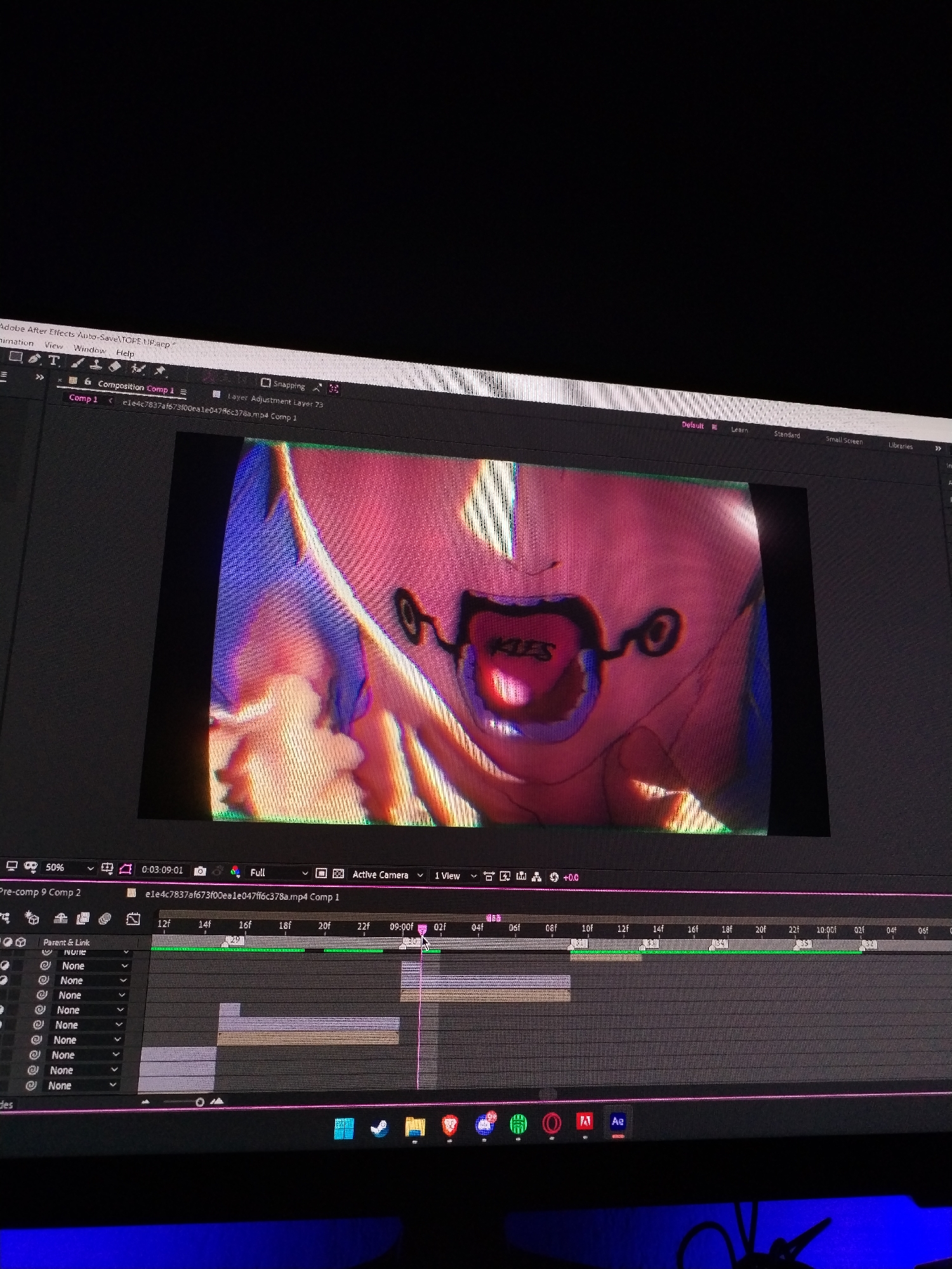 computer screen displaying Adobe After Effects software. The software is open to a project, showing a timeline and a composition window with a stylized image that includes the word "KISS." The program's timeline is visible at the bottom, showing several layers. Various tool icons from the software are visible on the screen. The computer screen is located in Graf Ignatievo, Bulgaria. The room appears to be dimly lit. A blue light source is visible in the lower part of the picture.