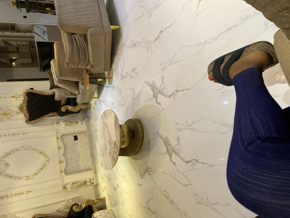 The image depicts an interior room in Galadimawa, Nigeria, characterized by a luxurious and ornate decor. The floor is covered in large white tiles with a grey and gold marble pattern. The walls are white with elaborate gold-accented moldings and decorative panels, including a large white and gold decorative fireplace mantel. Furniture visible includes: * Two black velvet high-backed chairs with gold frames, one partially visible on the far left, and another positioned against the right wall. * Two light brown/beige upholstered armchairs with gold-capped legs, positioned in the middle-right. * An oval coffee table with a white and gold marble-patterned top and a prominent gold sculptural base, situated in the center-left foreground. * A small round side table with a dark base and a copper-toned top is placed between the two beige armchairs. In the immediate foreground, a person's lower legs and feet are visible, extending from the bottom right towards the center. The person is wearing dark blue pleated trousers and black two-strap slides with a cork sole. Red nail polish is visible on the toes of the visible foot. The scene is well-lit, with light reflecting off the glossy floor and metallic surfaces.