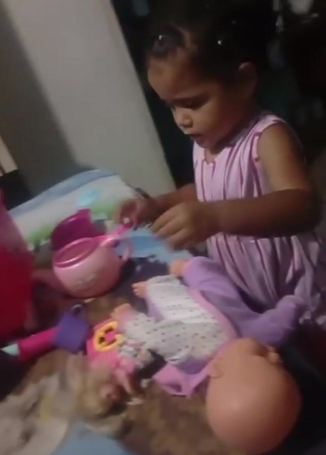 A young child stands next to a table covered with toys and blankets. The child has dark hair styled in small braids with beads, and wears a pink and white striped sleeveless dress over pink leggings. The table is covered with a blue patterned blanket and holds a collection of toys, including a pink toy tea set, a small doll, and a larger, headless doll body dressed in purple. The child picks up a toy spoon and appears to be playing with the toys on the table. The background shows parts of a room, including a laundry basket with clothing and a dark corner. The lighting in the room is dim.