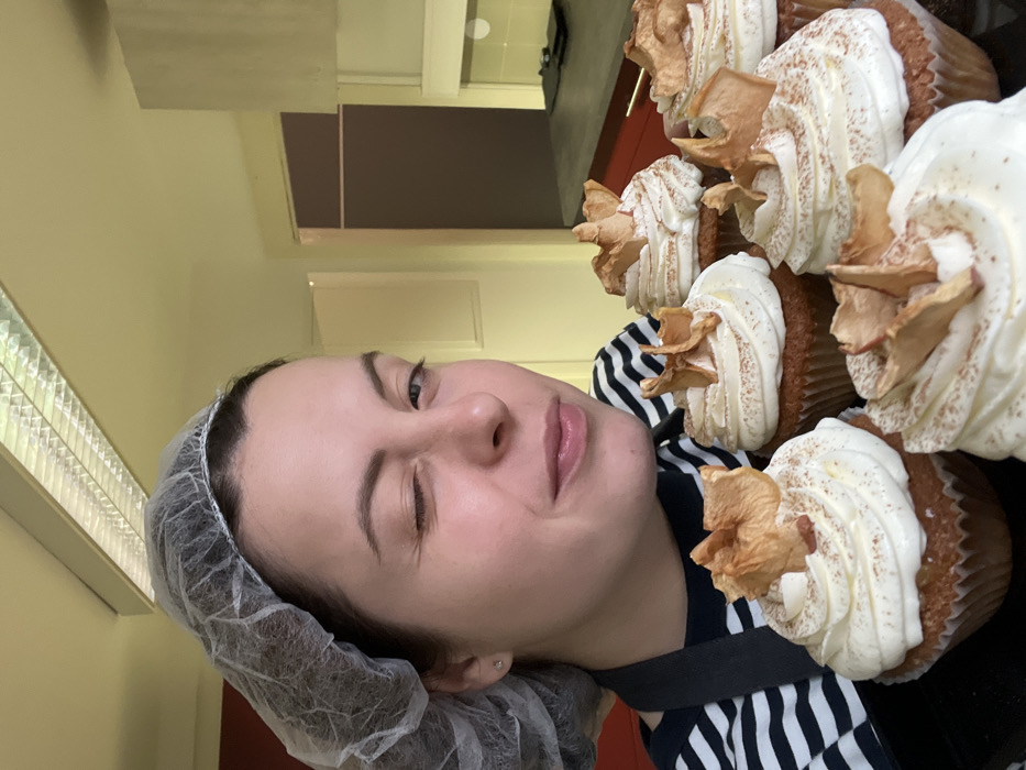 The image displays a female subject, observed from a slightly angled frontal perspective, winking with her left eye and smiling. She wears a white disposable hairnet, a dark and white striped shirt, and a dark apron. A small, light-colored stud earring is present in her left ear. The subject is holding a dark tray containing at least seven cupcakes, prominent in the foreground. Each cupcake consists of a light brown base in a paper liner, topped with white piped frosting, dusted with a light brown powder, and garnished with several pieces of dried, light brown fruit, appearing consistent with dried apple slices. The scene is an indoor environment, identifiable as a kitchen or bakery. The background features light-colored walls, with a section of a red wall or door visible on the far left. A fluorescent light fixture with a reflective grille is affixed to the ceiling. To the right, a dark grey countertop is visible, supported by red cabinet bases. A dark object, possibly an electronic device, rests on the countertop. A doorway or opening leading to an adjacent room with darker walls is present in the mid-background. The specific location within the city of Meisenheim, Germany, is not visually discernible from the image content.