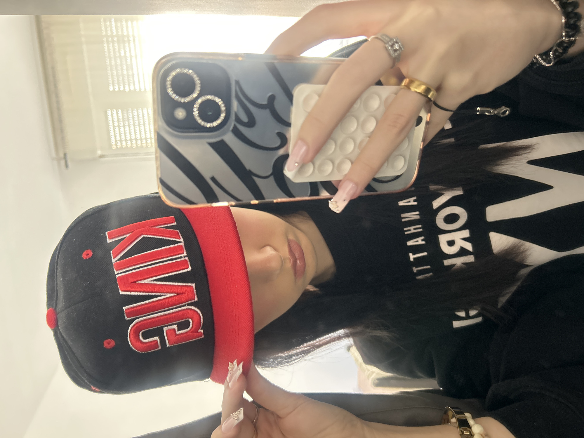 A medium close-up, mirror-reflected image depicts an individual indoors, taking a selfie. The person's face is largely obscured by the red brim of a black baseball cap, which features the word "KING" embroidered in red with a white outline, appearing reversed due to the reflection. The individual wears a black long-sleeved garment with reversed white text, likely "NEW YORK." Long, dark hair is visible. The right hand of the individual (viewer's left) lightly touches the brim of the hat. This hand displays long, square-shaped fingernails with a light pink base, white tips, and small rhinestone embellishments on the ring and pinky fingers. A gold-toned bracelet with white beads is present on the right wrist. The left hand (viewer's right) holds a smartphone, likely an iPhone model, encased in a clear cover with black wavy patterns. The phone's dual camera lenses are accentuated with sparkly, rhinestone rings. A white, rectangular pop-socket style grip with a textured, circular pattern is attached to the back of the phone case. On the left hand, a plain gold-colored ring is on the index finger, and a silver-colored ring with a prominent clear stone is on the ring finger. A black elastic or cord is visible around the left wrist, with a small silver charm hanging from it. The background, visible in the reflection, is an indoor room with light-colored walls. A window with horizontal slatted blinds and a light-colored curtain is visible, admitting bright natural light. The specific location within Cachan, France, is not discernible from the visual evidence provided.