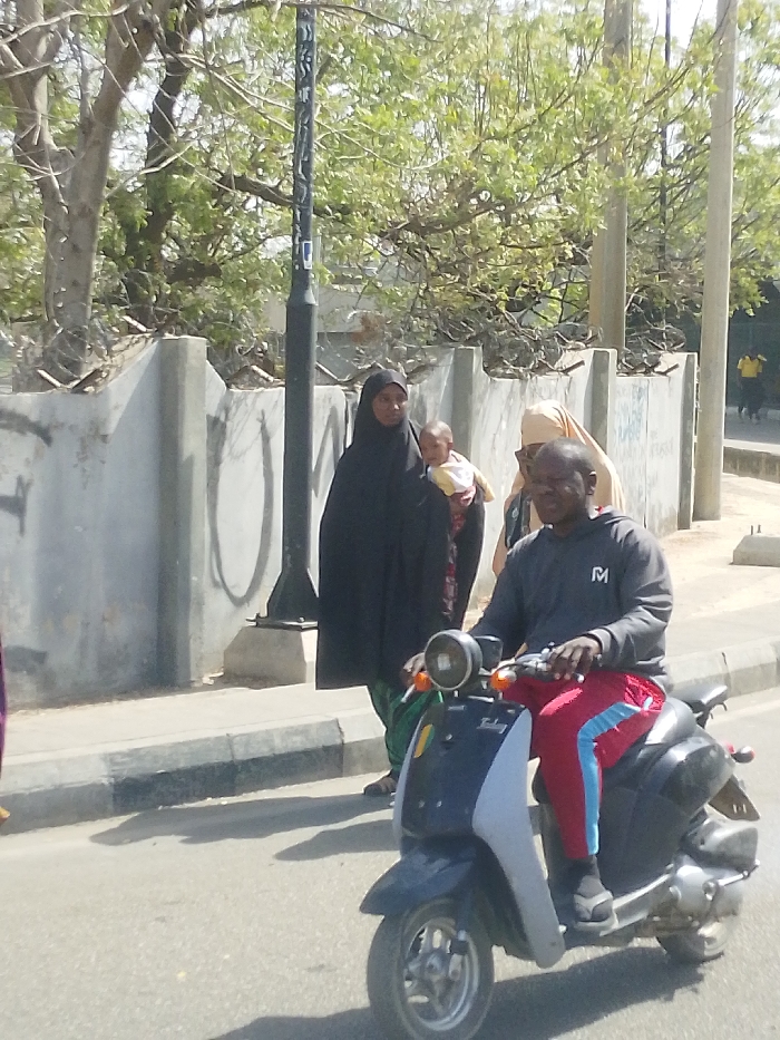 The scene is a daytime street in Tarauni, Nigeria. In the foreground, a male individual is seated on a black and light-grey scooter, positioned on the asphalt road. He wears a grey hooded sweatshirt with a white "M" logo and red track pants with light blue side stripes, along with dark flip-flops. His hands are on the handlebars. To the left, on a raised concrete sidewalk, an adult female in a black full-length garment and head covering is walking, carrying a small child wrapped in a light-colored top and patterned fabric. Another individual with a light-colored head covering is partially visible behind the woman and child. A black street light pole stands on the sidewalk between the scooter and the walking individuals. In the background, a concrete wall with some faded markings runs along the sidewalk, topped with barbed wire. Behind the wall, numerous trees with green foliage are visible under bright sunlight. Further in the background to the right, a person in a yellow shirt is partially visible. The road surface is asphalt, and the sidewalk curb is painted black and white.