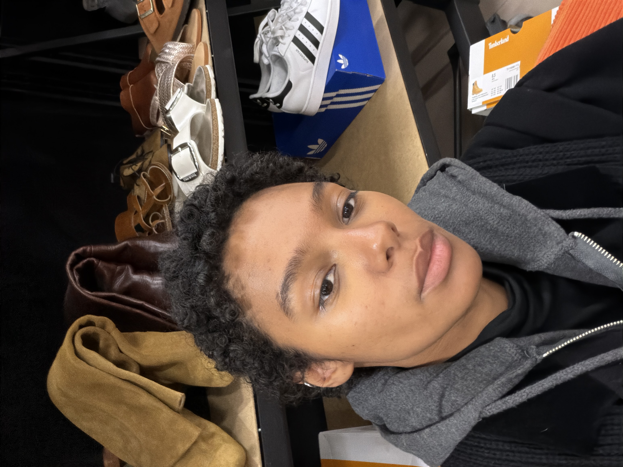 A close-up, chest-up selfie captures a female with dark skin, short, tightly curled black hair, and brown eyes, looking directly at the camera. She wears a grey hooded sweatshirt over a dark high-neck top, with a black textured outer garment partially visible. A small silver hoop earring is present in her left ear. The background consists of multiple shelves constructed from light-colored wood or laminate with black metal supports. The top shelf displays a folded tan textile, possibly suede, alongside a folded dark brown leather item. The middle shelf holds various pairs of women's footwear, including brown flat sandals, white slip-on sandals with a prominent silver buckle, and sandals with a metallic rose gold woven strap. On the lower right shelf, a pair of white Adidas Superstar sneakers with black stripes rests atop a blue Adidas shoebox. Partially visible at the bottom right are sections of an orange shoebox and an additional white box. The scene depicts an interior setting, likely a retail space or storage area for footwear and accessories, located in the city of Pantin, France.