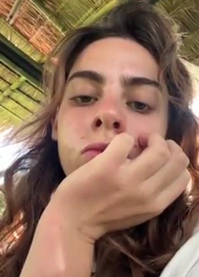 A woman with long, wavy brown hair and fair skin rests her head on her hand, looking directly at the camera. She has a slightly red nose and some freckles. She closes her eyes briefly before the camera shifts, and bright sunlight overwhelms the scene. The background appears to be a thatched or woven roof structure. The woman wears a white shirt.