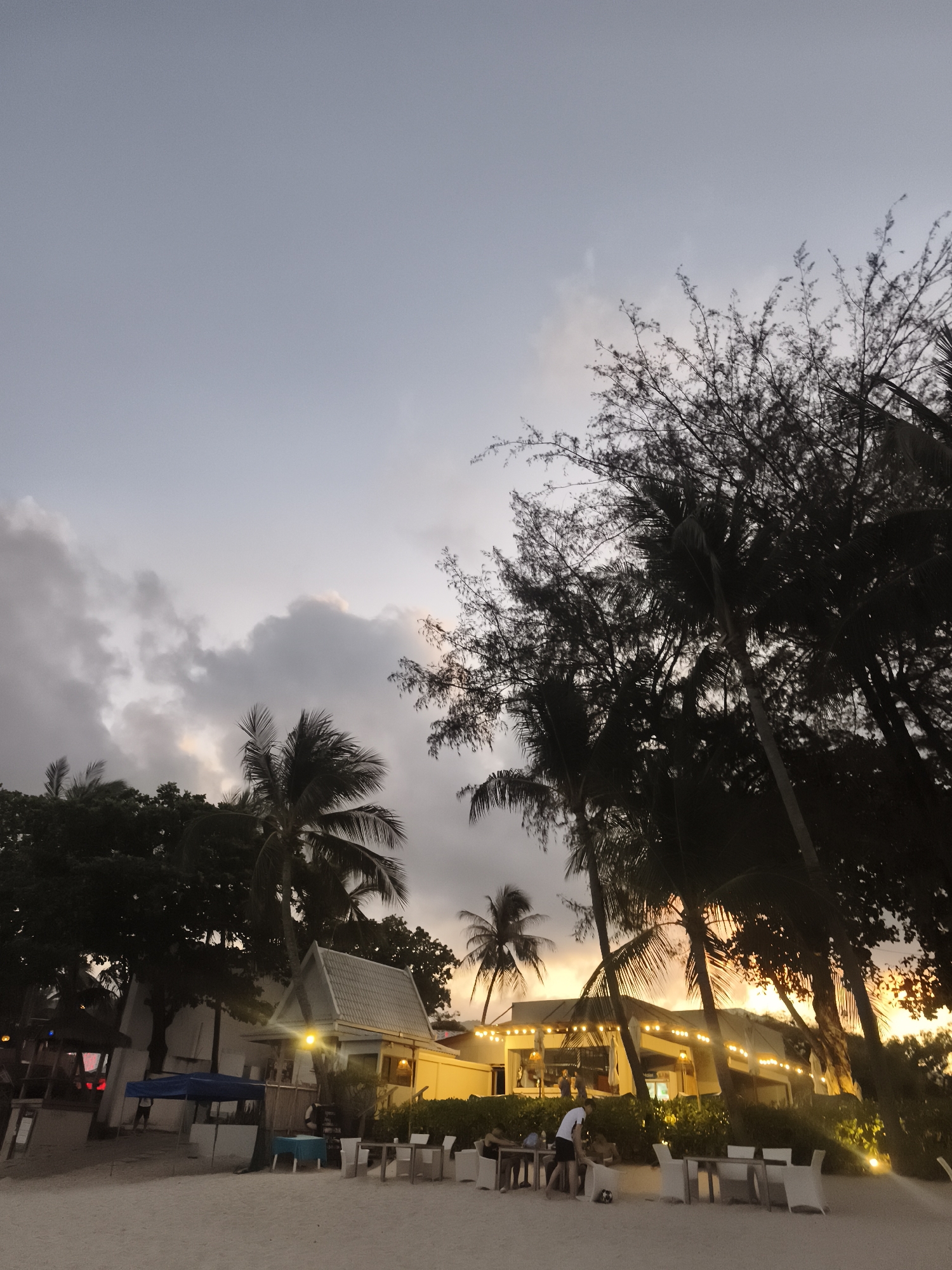 Captured in Baan Chaweng, Thailand, the image portrays a tranquil beachside scene during the transition from day to dusk. The sky above is a blend of gray and pale orange hues, suggesting either sunrise or sunset, with scattered cloud formations. Silhouetted palm trees and other greenery frame the scene, creating a natural border. In the foreground, a sandy beach is dotted with outdoor dining arrangements, including tables and chairs, suggesting a restaurant or beach club. Soft illumination comes from string lights and outdoor lighting fixtures, casting a warm glow on the tables and surrounding vegetation. Several individuals are present, some seated at tables, while one person stands, possibly interacting with others. The scene exudes a relaxed, vacation-like ambiance.