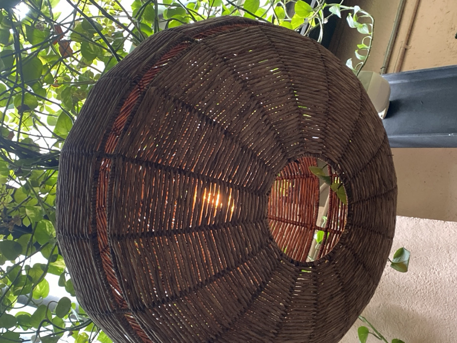 - "A large, spherical pendant lamp shade, crafted from dark brown woven natural fibers, is centrally positioned and viewed from a low angle" by FM-Cwxsv2, licensed under CC BY 4.0