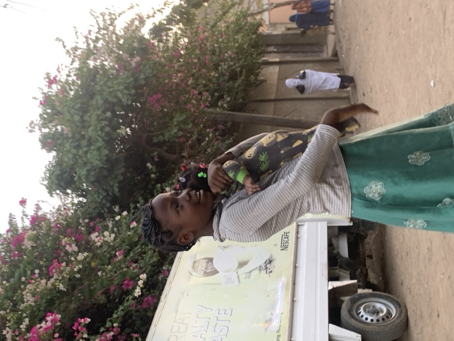 The image depicts a street scene in Gwagwarwa, Nigeria, under what appears to be natural outdoor lighting. In the foreground, a young female, approximately 8-12 years old, with dark skin and braided hair, stands facing right and slightly smiling. She wears a light grey horizontal striped long-sleeved shirt and a teal-green long skirt with light-colored floral patterns. She is holding an infant, who is facing away from the camera, wearing a dark grey long-sleeved onesie patterned with lighter-colored animals; a green hair ornament is visible on the infant's head. Behind the subjects, to the left, a white commercial delivery truck is partially visible, bearing the text "GREAT TASTE" and "NESCAFÉ" branding with a coffee cup graphic. A large, blooming bush or tree with abundant pink and white flowers dominates the upper left and mid-background. Further right, additional green foliage is visible. The ground is unpaved dirt. In the mid-to-far background, a light-colored building is present. Three additional individuals are visible further down the unpaved street: one person in a white, full-body garment (possibly a burqa) facing away from the camera, and two more individuals further beyond, one in blue attire and another in patterned brown/orange clothing.