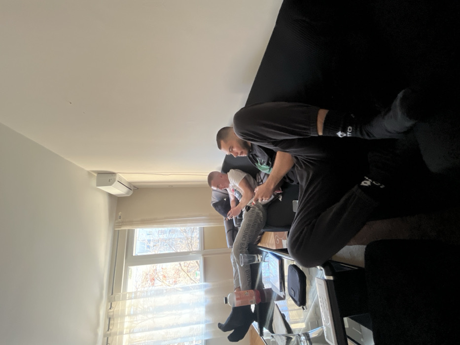 The image depicts an indoor residential scene, likely a living room, located in Plovdiv, Bulgaria. Two adult males are visible, both seated on dark-colored sofas, engaged with personal electronic devices during daylight hours. In the foreground, on the right, a male with short dark hair and a beard is seated on a black sofa. He wears a dark t-shirt, dark sweatpants, and black socks with a white "LOTTO" logo. His body is angled slightly left, with his right leg bent and foot resting on the sofa. He holds a white electronic device, possibly a smartphone, with both hands, appearing to interact with its screen. Further back and to the left, a second male with short, light hair is seated on another black sofa, facing right. He wears a white t-shirt, light grey sweatpants patterned with "ARMANI BRUNO BANANI" text, and dark socks. His legs are extended onto a black, reflective coffee table positioned in front of the sofas. He also holds a white electronic device, resembling a smartphone or portable gaming console, with both hands, looking at its screen. The coffee table holds various items, including a clear bottle containing a reddish liquid, a clear drinking glass, a white electronic tablet, a small black pouch, a white remote control, and a white rectangular device. Behind the second male, a large window dominates the left wall, draped with sheer white curtains. Through the window, tree branches with red accents and a distant building are visible. An air conditioning unit is mounted high on the wall above the window. The room walls are a plain light color, and a light-colored wooden floor is partially visible beneath the coffee table. There are no direct interactions between the two individuals; both are independently focused on their devices.
