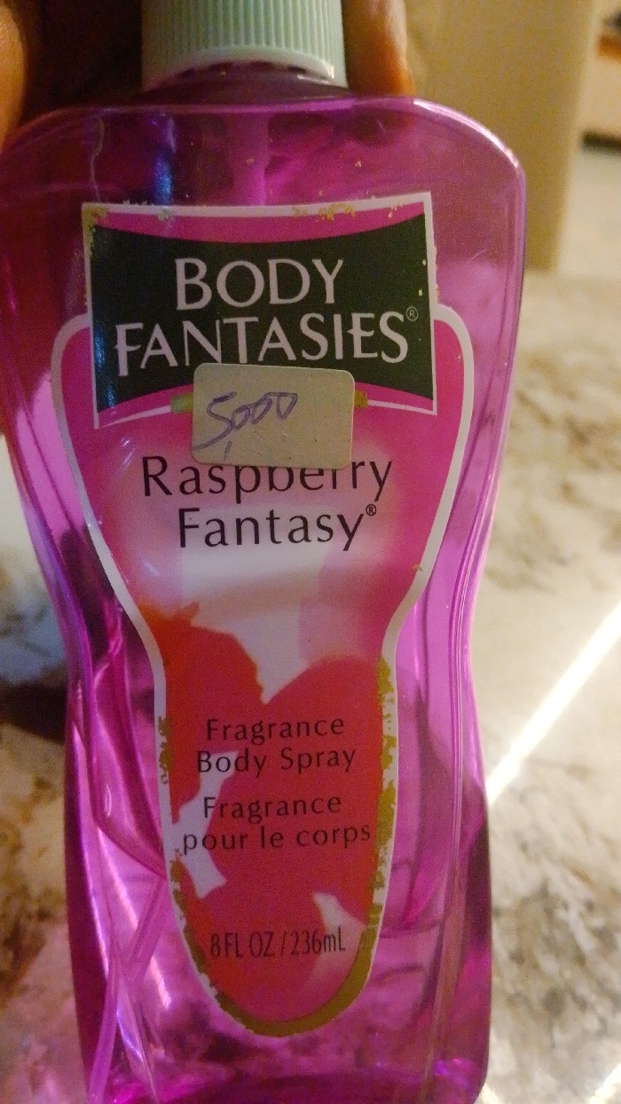 A close-up image depicts a translucent pink plastic bottle of "BODY FANTASIES Raspberry Fantasy" Fragrance Body Spray, 8 FL OZ / 236mL, held by a hand with light brown skin, at an unknown location in Unknown, Unknown