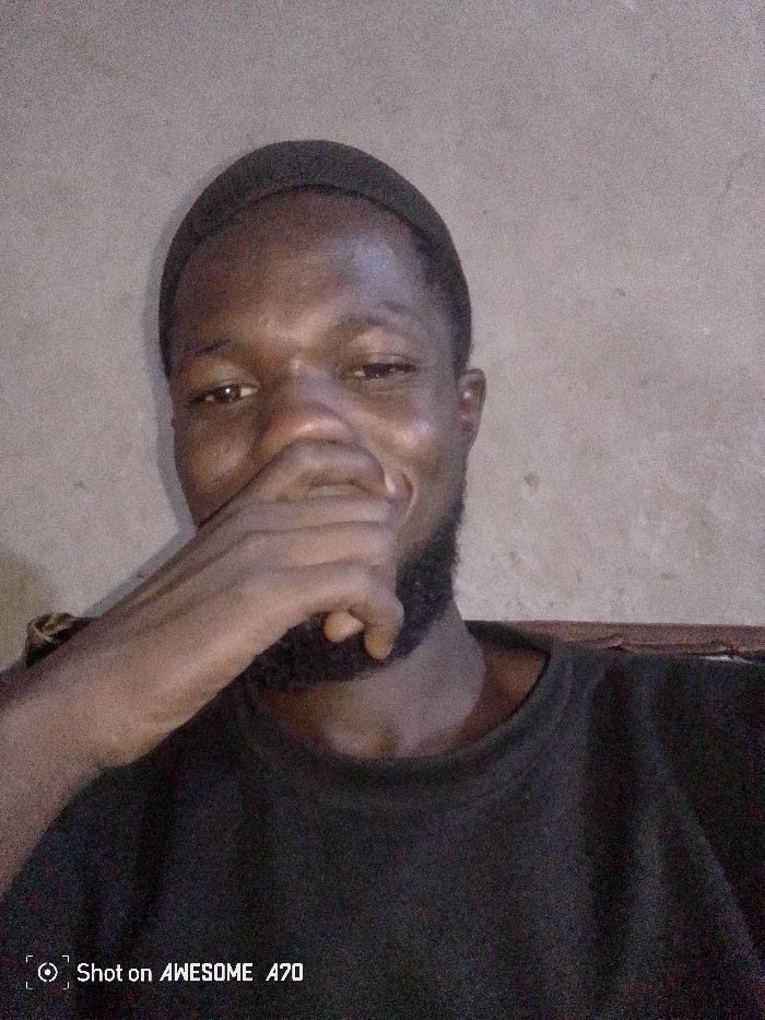 A dark-skinned man with a beard and a black cap is shown from the chest up. His hand is partially covering his mouth, and he is smiling slightly. He's wearing a black t-shirt. The background is a plain, textured wall, and the lighting appears to be dim. The lower left corner includes "Shot on AWESOME A70".