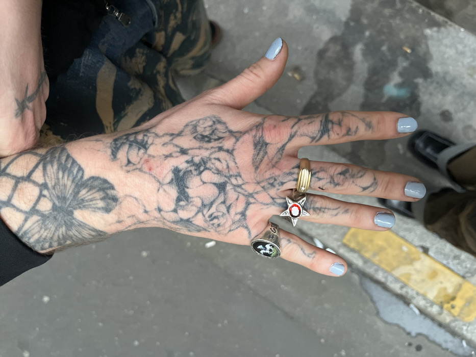 A fair-skinned hand, heavily tattooed with black ink floral and abstract designs, is adorned with three rings. A wide gold band is on the index finger, a star-shaped ring with a red gemstone is on the middle finger, and a silver ring with a black and white design is on the ring finger. The nails are painted a light blue-gray color. The wrist and part of the forearm are also tattooed. In the background are clothing and a glimpse of a shoe on concrete.