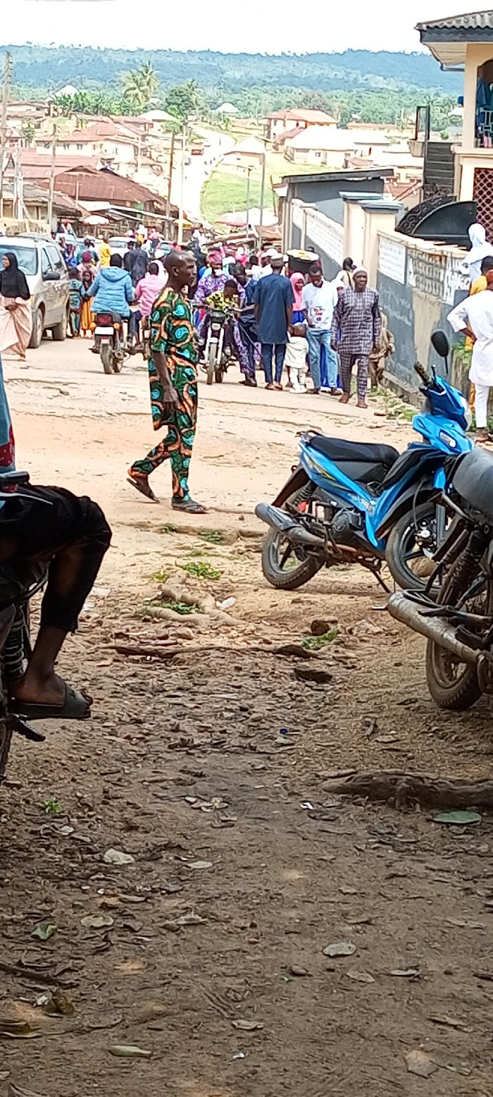 The image depicts a crowded, unpaved street in Aramoko-Ekiti, Nigeria, observed from a low vantage point