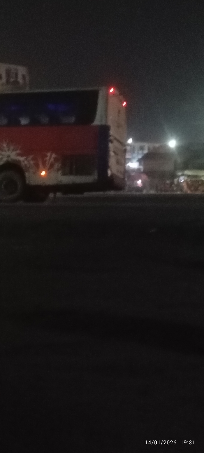 At night, a blurry bus is captured in the scene. Its side is adorned with a red and white snowflake-like design. Red lights are visible near the top of the bus. Behind it, several other vehicles and buildings are discernible, illuminated by dim lights. The foreground is dominated by a dark, flat surface, possibly a road or pavement. The date and time stamp "14/01/2026 19:31" is displayed in the lower right corner.
