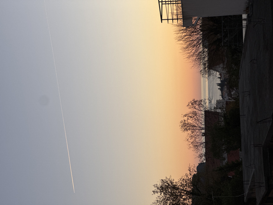 This image depicts a wide-angle landscape scene at sunrise or sunset in Donji Pobori, Montenegro. The sky occupies the upper two-thirds of the frame, exhibiting a gradient from light blue at the zenith to orange and yellow at the horizon. A faint, white contrail extends diagonally across the upper left sky, and a dark circular artifact is visible in the upper-middle portion. In the distance, the Adriatic Sea appears calm, separating the sky from the land. The midground and foreground reveal a hilly, developed area. Numerous residential buildings with distinct red-tiled roofs are interspersed among trees, some appearing bare, others with sparse foliage, suggesting a colder season. On the far right, a section of a white building with a dark metal balcony railing is prominent, along with a white downspout. The immediate foreground consists of a dark, flat concrete slab with multiple vertical rebar elements, indicating an active construction site or an unfinished rooftop structure. No individuals or discernible actions are visible within the frame.