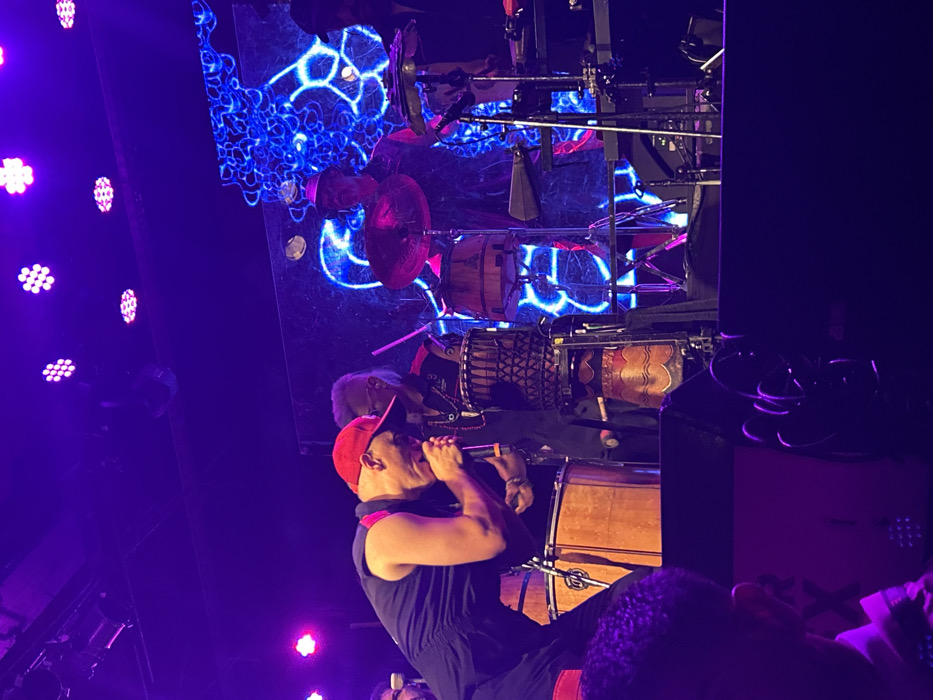 A live music performance shows a bald male singer with a red cap holding a microphone. Behind him, a drummer plays a set of percussion instruments including djembe and bongo drums. A reflective screen or mirror displays blue lighting patterns above the drums. Additional stage lights appear in the background, creating a lively atmosphere. Crowd heads are visible in the foreground.