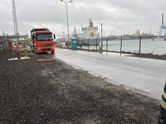 This image depicts an industrial port scene at Maasvlakte, Rotterdam, Netherlands, under an overcast sky
