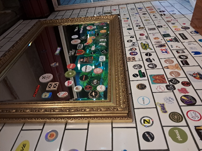The image displays an interior scene focusing on a white subway-tiled wall in a commercial establishment, likely located in Caracas, Venezuela, as indicated by visible "Solera" branding and other local identifiers. A large, ornate, gilded mirror is mounted horizontally on the upper section of this wall. The tiled wall is extensively covered with numerous circular and irregularly shaped stickers featuring diverse logos, text, and graphic designs. Prominent stickers include "Imagine," "7," "plenti," "vino," "Libre," "650 id," "650," and "Solera." Other stickers depict a seated nude female figure and two stylized anthropomorphic figures. The mirror itself has several smaller stickers affixed directly to its surface, such as "Furia," "Palma," "Paw Patrol," and "Hot Wheels." The mirror reflects the opposite interior of the establishment, revealing green, tropical-patterned elements, various illuminated signs (including one red sign that appears to spell "WOOF"), and additional brand stickers. A dark vertical element, possibly a doorway or window frame, is visible in the far right reflection. In the bottom right corner of the foreground, a segment of a light brown table or countertop is partially visible. No individuals are present or actively engaged in the scene. The environment suggests a trendy cafe, restaurant, or bar.