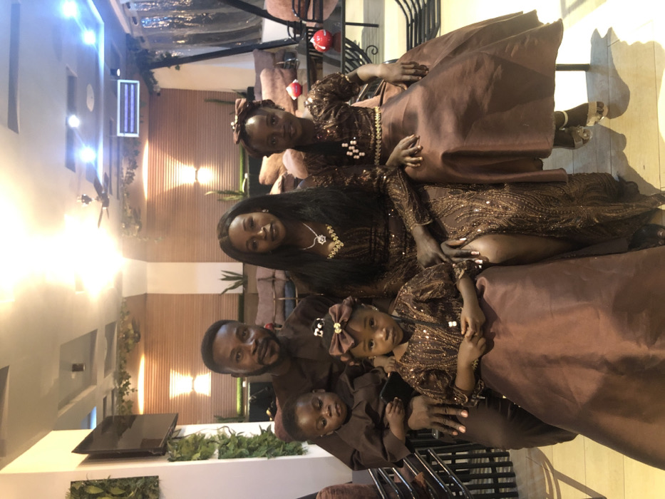 A family of five poses indoors, all dressed in brown. The mother wears a sequined dress and a necklace. The father is in a brown shirt. The children, two girls and a boy, are in matching outfits with sequined tops and brown skirts or shirts. The girls have bows in their hair. The background features restaurant decor, including lights, plants, and seating.