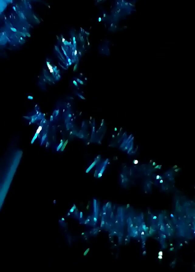 close-up, low-light shot of sparkly garland. The garland appears to change color, starting in blue, then transitioning to green, and ending with a brief flash of red. The background remains dark.