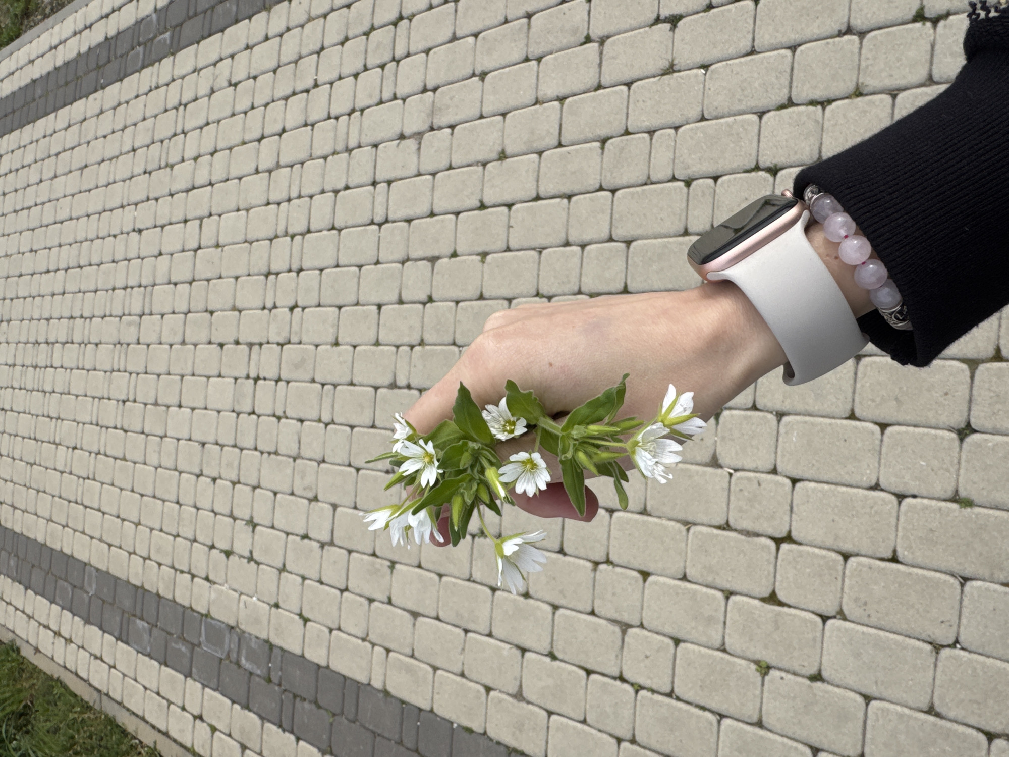 - "A woman's hand, adorned with a pink beaded bracelet and a smartwatch with a white band, holds a small bouquet of delicate white flowers with green leaves" by FM-fYcxL2, licensed under CC BY 4.0