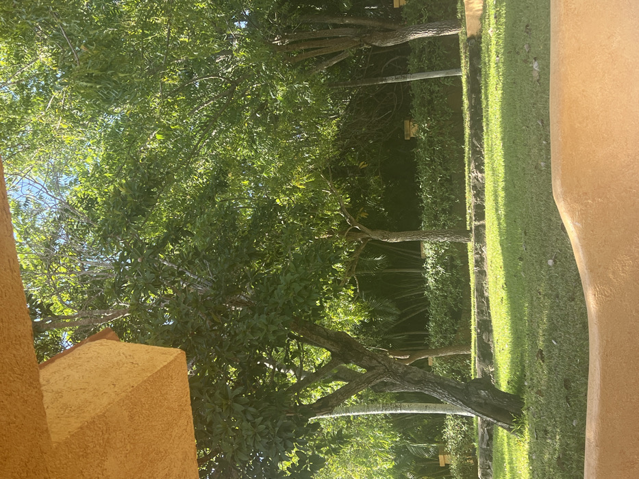 The image depicts a lush, green landscape featuring trees, grass, and foliage. Sunlight streams through the trees, creating dappled shadows on the ground. Two beige walls are on the right and left sides. There is a dark hedge in the background.