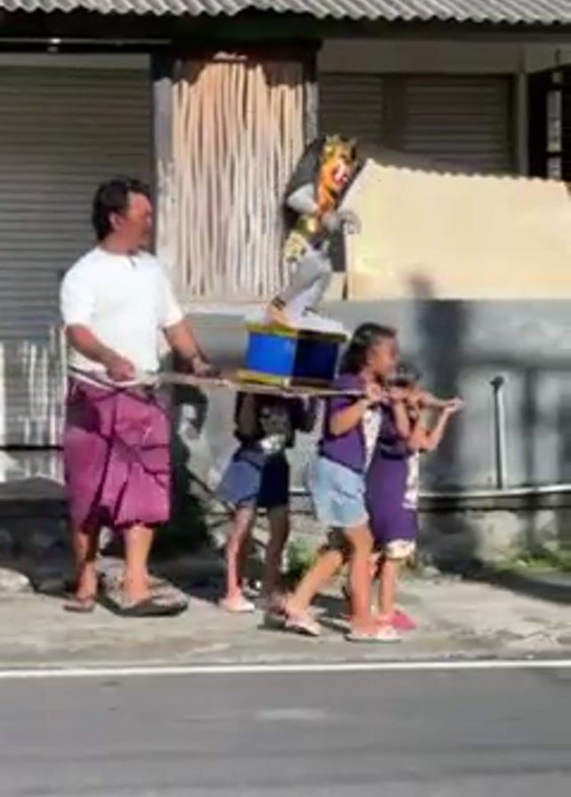 A man and two young girls are carrying a statue of a demon along a road in a residential area. The man, dressed in a white shirt and purple wrap, carries the front end of two parallel wooden poles. The two girls, wearing matching purple shirts and denim shorts, carry the back end. The statue, on a blue and yellow platform, depicts a demonic figure with a sword. The houses in the background are simple, with tiled roofs and some greenery. Another woman in a white patterned dress is seen briefly behind the group.