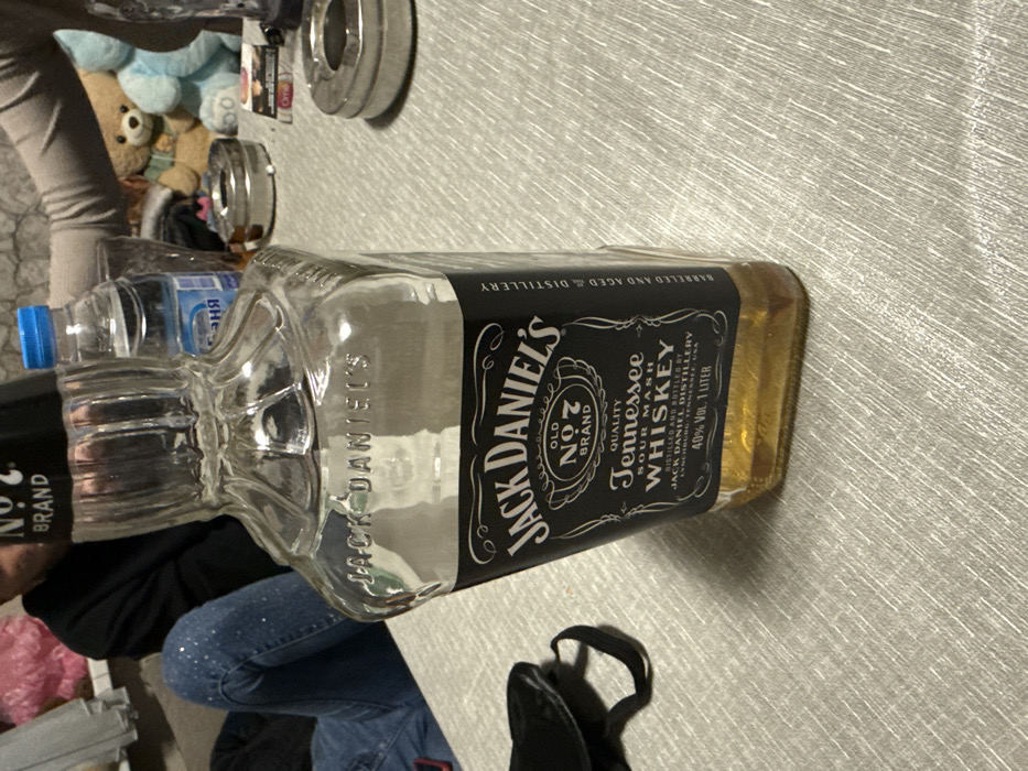 The scene depicts an indoor setting, likely a domestic residence in Sofia, Bulgaria, as evidenced by Cyrillic text ("Баня") on a visible water bottle. A 1-liter bottle of Jack Daniel's Old No. 7 Tennessee Whiskey, approximately one-fifth full, stands upright on a light-colored, textured table surface. The bottle's black label, indicating 40% Vol., is clearly legible. In the upper left background, a seated individual is partially visible, wearing a black long-sleeved top and blue jeans embellished with small, reflective elements. A pink, soft object rests behind them. To the right, an arm clad in a light grey long-sleeved garment is partially visible on the table. Objects on the table include a clear plastic bottle with a blue cap and Cyrillic labeling, a transparent drinking glass, two chrome ashtrays (one containing a discarded cigarette), and a partial pack of cigarettes. In the background, two plush teddy bears, one brown and one light blue, are discernible against a textured wall.