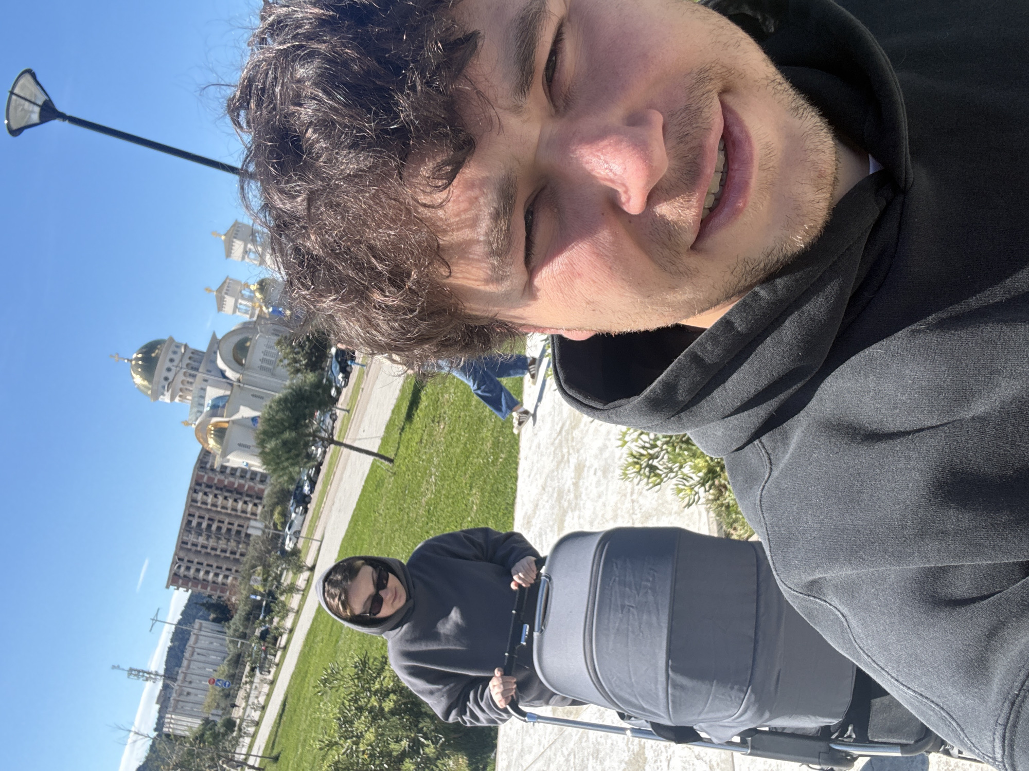 A selfie shows a fair-skinned young man with curly brown hair and a black hooded sweatshirt smiling at the camera. Behind him, another person in a grey hooded sweatshirt is pushing a grey stroller. The background includes a green lawn, a paved path, and buildings, including the Orthodox Cathedral of St. John Vladimir in Bar, Montenegro, visible by its golden domes. A lamp post is also visible in the background. The lighting suggests a sunny day.