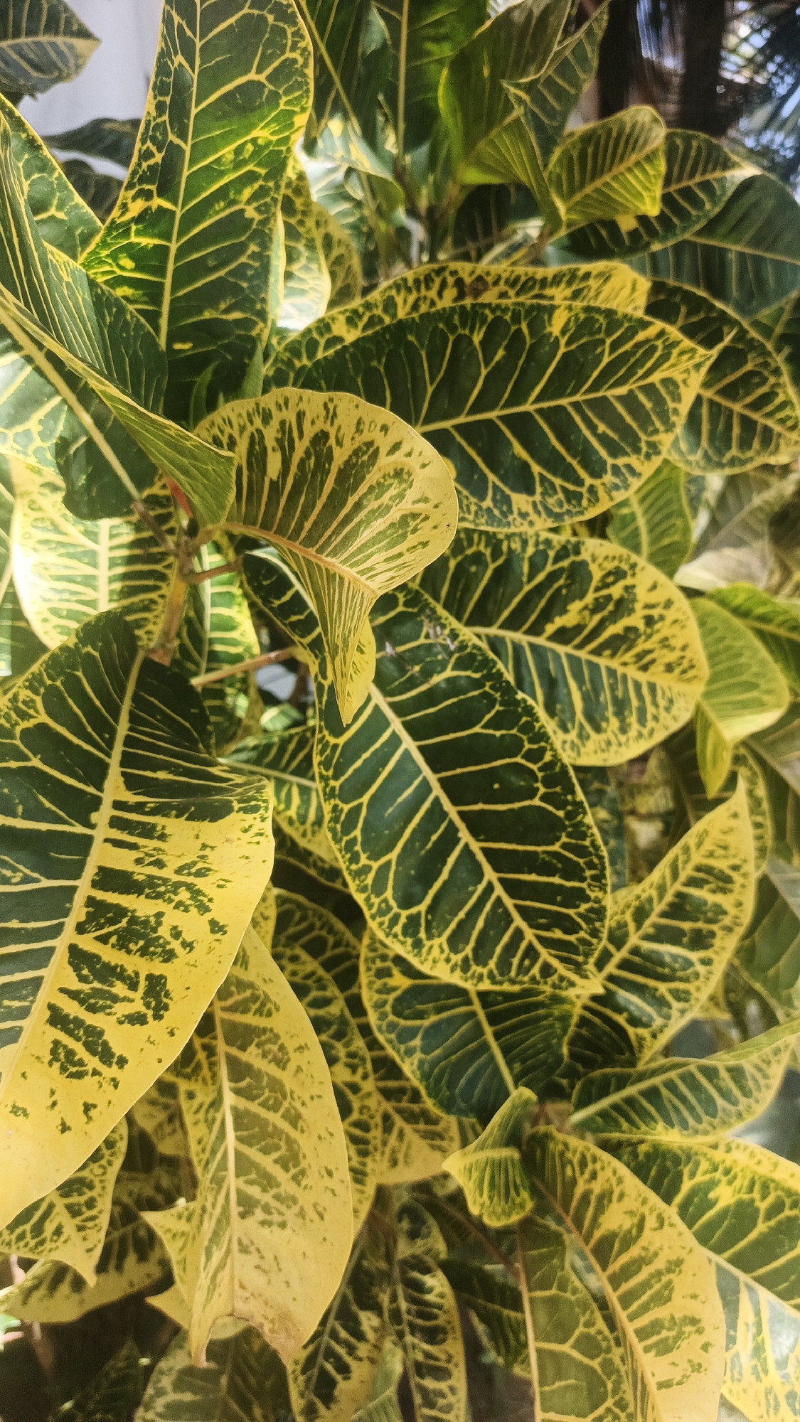 - "close-up of Croton plant leaves, characterized by their yellow and green coloration with prominent yellow veins" by FM-Xmals1, licensed under CC BY 4.0