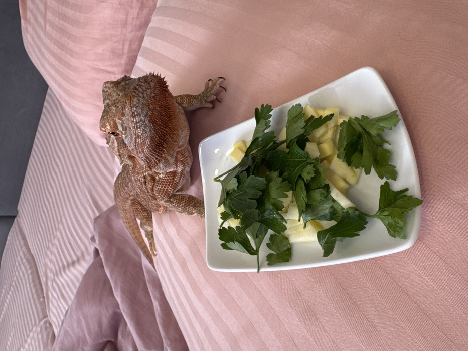 The scene depicts an indoor domestic environment, specifically a bedroom in the city of Yakhroma, Russia. A reddish-orange bearded dragon (Pogona vitticeps) is positioned on a bed covered with light pink striped sheets. The lizard's body is oriented towards the left, with its head turned slightly forward and right, observing a white, rectangular dish placed directly in front of it on the bed. The dish contains chopped light-yellow food items, likely a fruit or vegetable, mixed with fresh green parsley leaves. A matching pink pillow is visible to the right of the lizard, and a dark grey headboard or wall section is present in the upper left background. The bearded dragon appears to be stationary, observing the presented food, with no active consumption or physical interaction captured.