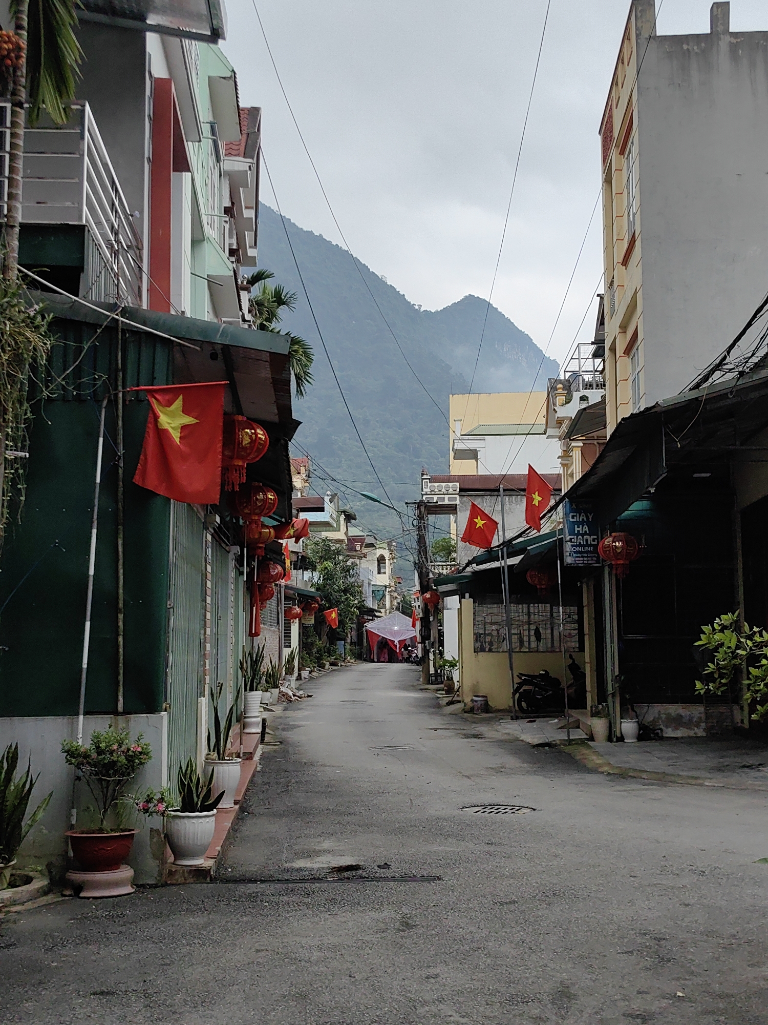 Captured in Thành phố Hà Giang, Vietnam, the image portrays a narrow street flanked by buildings of varying heights and colors. The street's asphalt surface shows signs of wear and minor water accumulation. Vietnamese flags are prominently displayed on buildings along the street, accompanied by traditional red lanterns. Potted plants line the edges of the street, adding greenery. In the distance, a mountain rises, partially obscured by clouds or mist. Overhead, power lines crisscross between the buildings, contributing to the urban setting. No individuals are clearly visible in the frame.