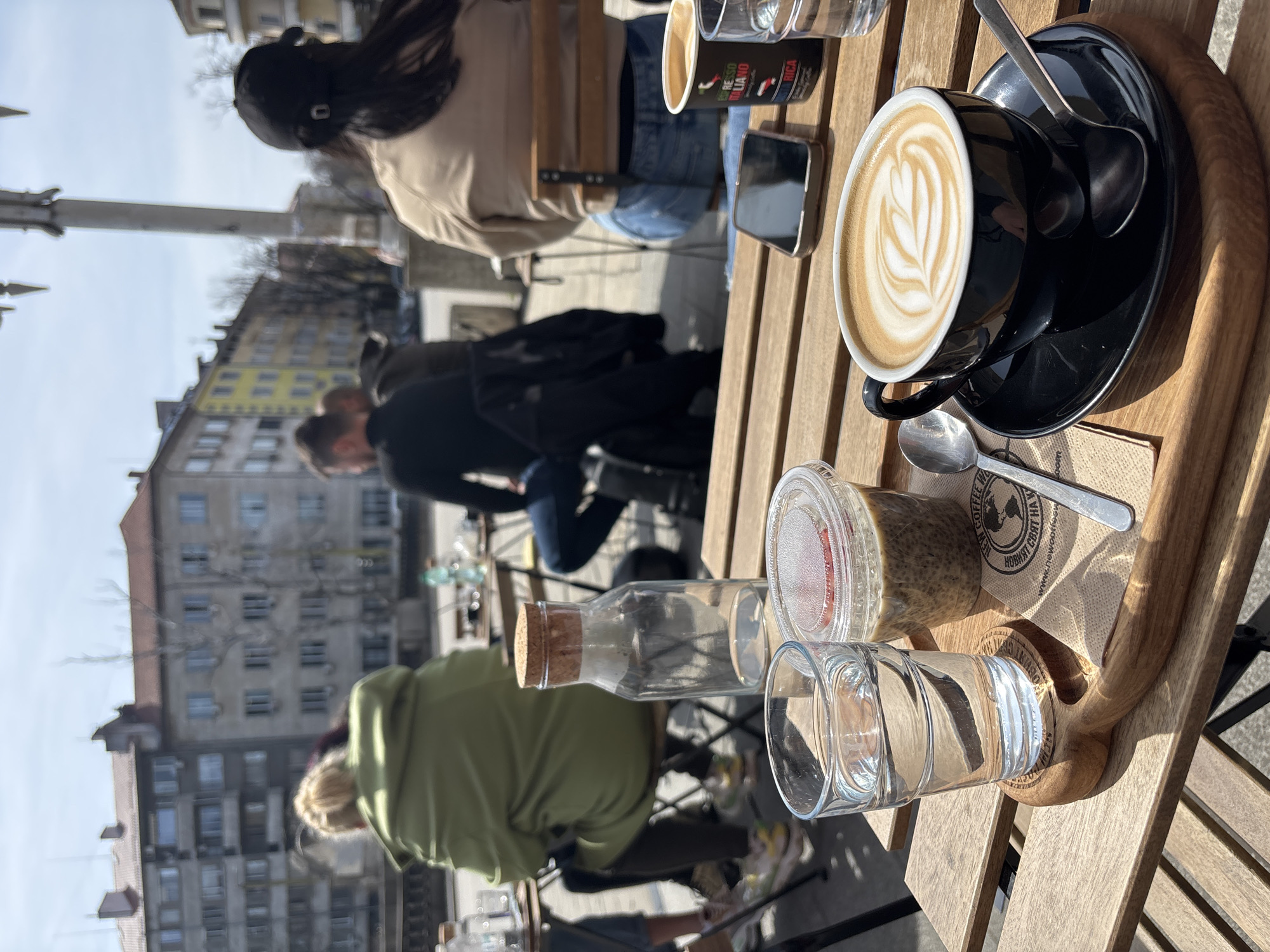 The image captures an outdoor café scene on a sunny day in the city of Gabrovo, Bulgaria. In the immediate foreground, a wooden slatted table displays a black ceramic cup with a latte art design, placed on a black saucer with two dark spoons. To its left, a small wooden serving board holds a clear glass containing water with a coin at the bottom, resting on a round wooden coaster. Adjacent to the glass is a clear plastic cup with a translucent red lid, containing a beige, granular substance, likely a type of pudding or overnight oats. A small metal spoon lies on a brown napkin branded with "NEW COFFEE WORLD." Further back on the table, an empty clear glass bottle with a cork stopper stands next to the water glass. A black smartphone with a dark case rests near a disposable coffee cup featuring "Espresso Italiano" branding. Another glass of water is partially visible. In the midground, several individuals are seated at other outdoor café tables, their backs mostly to the camera. On the left, a person with blonde hair, styled in a bun, wears a light green or khaki hooded jacket. To the right, another person wears a beige jacket, a black baseball cap, and blue jeans. Further back, two men are partially visible, one in a dark top. The background reveals urban architecture characteristic of Gabrovo. Multi-story buildings, some with multiple windows and balconies, line the street. One building exhibits a distinct yellow facade, while others appear in shades of grey and brown. Several bare trees suggest either early spring or late autumn. A tall street light or decorative pole is visible on the right. The ground surface is paved, and strong sunlight creates clear shadows.