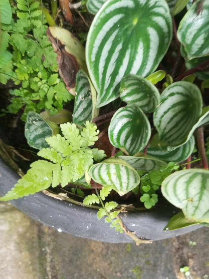 The scene depicts a close-up, top-down view of various plants growing within a dark gray or black planter pot, located in Pandaria, India. The dominant species is a Peperomia argyreia, commonly known as Watermelon Peperomia, characterized by numerous round to oval leaves displaying prominent alternating light and dark green stripes. These plants occupy the upper and right portions of the frame. Interspersed among the peperomia and densely covering the left and lower-left areas are smaller, delicate light green fern-like plants with finely divided fronds. The plants are rooted in dark soil, some of which appears moist. A section of the pot's textured rim is visible in the lower half of the image, and a muted, light-colored concrete or paved surface is partially visible directly beneath the pot. No human subjects or animals are present.