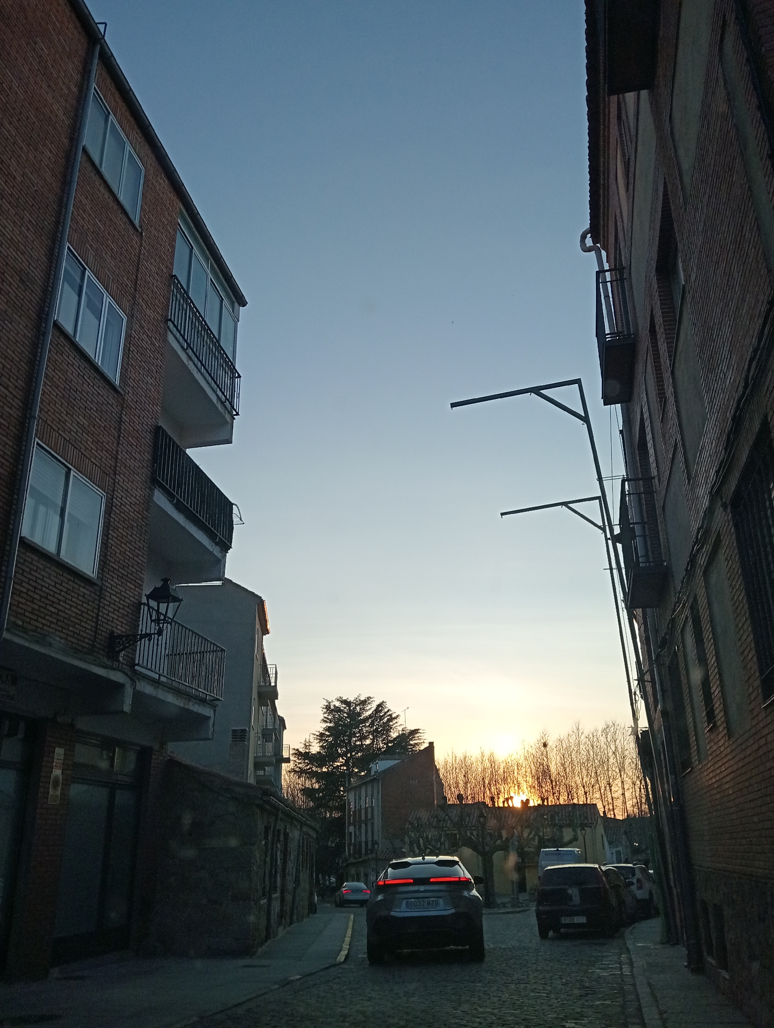 This image displays a narrow cobblestone street in Ávila, Spain, at approximately sunset. The sun, a bright orange disc, is visible low on the horizon at the end of the street, silhouetting a line of bare deciduous trees and distant buildings. On the left side of the street, a multi-story building constructed of reddish-brown brick rises vertically, featuring multiple white-framed windows and balconies with black metal railings. A gray downspout runs along its facade. The ground floor level is darker, appearing to house a commercial space, and an ornate, dark metal street lamp fixture is attached to the building at a lower level. Below this, a lower, darker-toned stone or rendered structure with several small windows runs parallel to the street. On the right side, another multi-story building, also primarily reddish-brown brick, lines the street, displaying windows, some with dark grates, and visible balconies. Two dark metal street light frames, devoid of luminaires, extend horizontally from this building over the street. In the center of the cobblestone street, a dark-colored SUV (Spanish license plate "0032 MZC") is positioned with its illuminated taillights facing away from the viewer, suggesting it is either moving slowly or stopped. Several vehicles are parked along the right curb, including a dark van (partially visible Spanish license plate "8138 GJD") behind the SUV. Further down the street, an evergreen tree stands prominently amongst other buildings and bare trees against the illuminated sky. No individuals are visible in the scene.