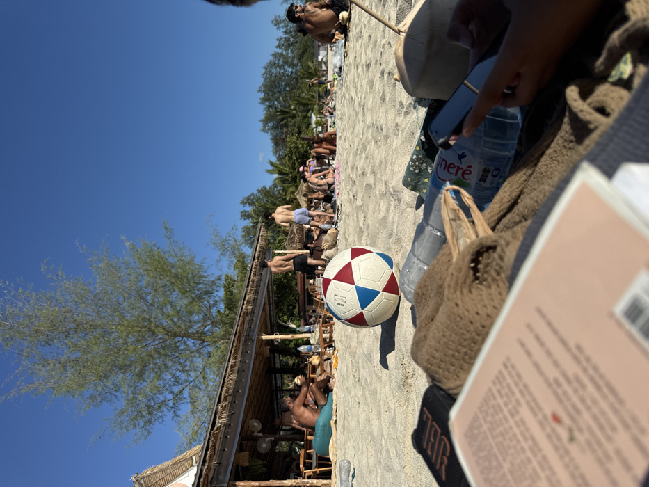 A wide-angle, low-perspective image captures a lively beach scene on a clear, sunny day in Baan Sri Thanu, Thailand. In the immediate foreground, a person's hands are visible operating a dark smartphone, resting on a brown woven fabric alongside a partially obscured clear plastic water bottle. An open book with light-colored pages and a black JBL speaker are also visible on the sand. A multi-colored FIFA-branded soccer ball, predominantly white with red and blue triangular panels, rests centrally on the light-colored sand, casting a distinct shadow to its right. The midground reveals a bustling sandy beach. To the left, a thatched-roof structure, appearing to be a beach bar or restaurant, features wooden supports and ceiling fans. A shirtless man is seated on a turquoise beanbag in front of this structure, holding a green coconut. Nearby, two other shirtless men stand on the sand; one in dark shorts faces right, and another in light blue shorts faces away from the camera. Numerous other individuals are scattered across the beach further back, some seated or reclining on towels and mats. On the far right, another person is seated, holding a coconut. The background is dominated by a clear, brilliant blue sky. Tall, slender green trees stand behind the thatched-roof structure and extend across the mid-distance, interspersed with other tropical foliage. Additional thatched-roof structures are visible further along the coastline, suggesting a developed beach resort area. The scene depicts leisure and activity under direct sunlight.