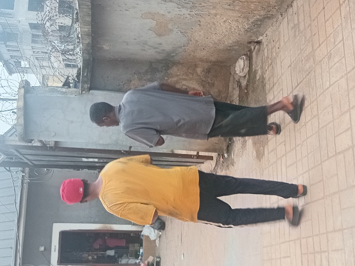 Two people stand outside in the image. One person wears a yellow shirt and a red hat. The other person wears a gray shirt and dark pants. They both wear sandals. The building on the left appears to have barbed wire on its roof. The person in yellow is closer to the camera than the person in gray. There is a building in the background.