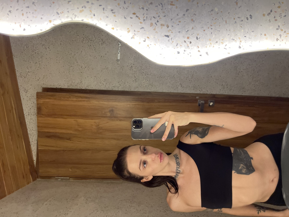 A woman in a black sports bra and leggings poses for a mirror selfie in a bathroom. The mirror's shape is curved with a light above. Her phone is in her right hand. Tattoos adorn her shoulders and neck. The bathroom features speckled tile and wood paneling. Her hair is dark and pulled back.