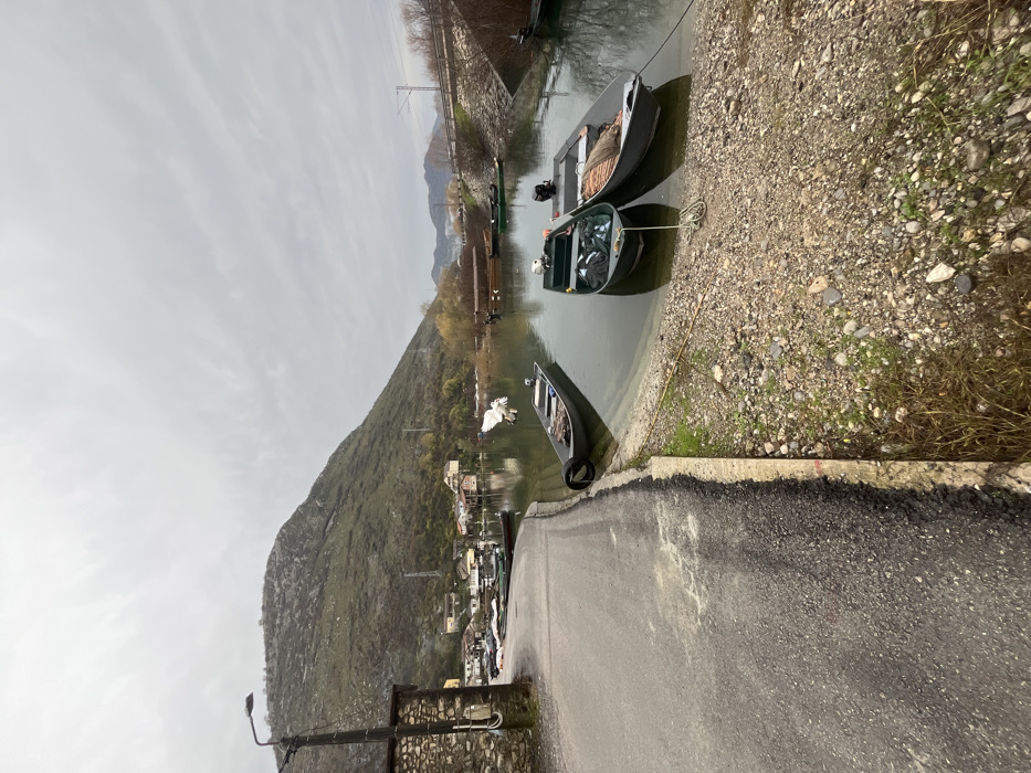 The image presents a waterfront scene in Vranjina, Montenegro, under an overcast sky. In the immediate foreground on the left, an asphalt road curves slightly to the right, bordered by a concrete curb and a gravelly, sparsely vegetated bank. A stone-built structure and a dark street light pole are visible on the far left. The midground features a calm body of water, likely an inlet or bay, with several small, open boats moored along the gravelly shoreline. Four boats are prominently visible: one long, dark vessel positioned diagonally with a black tire serving as a bumper on its bow, and two smaller, rectangular boats (one green, one grey) equipped with outboard motors. These two boats contain fishing nets or similar gear and are tied to the bank. A large white bird with its wings spread is captured in flight above the water near the dark boat. Additional boats are partially visible further in the water. The background is dominated by a large, verdant mountain rising on the left, with scattered residential buildings nestled at its base along the water's edge. To the right, a railway line, supported by a structure and featuring overhead electrical lines, runs parallel to the water's edge. Distant hills or mountains are faintly visible on the horizon beneath the grey, cloudy sky.