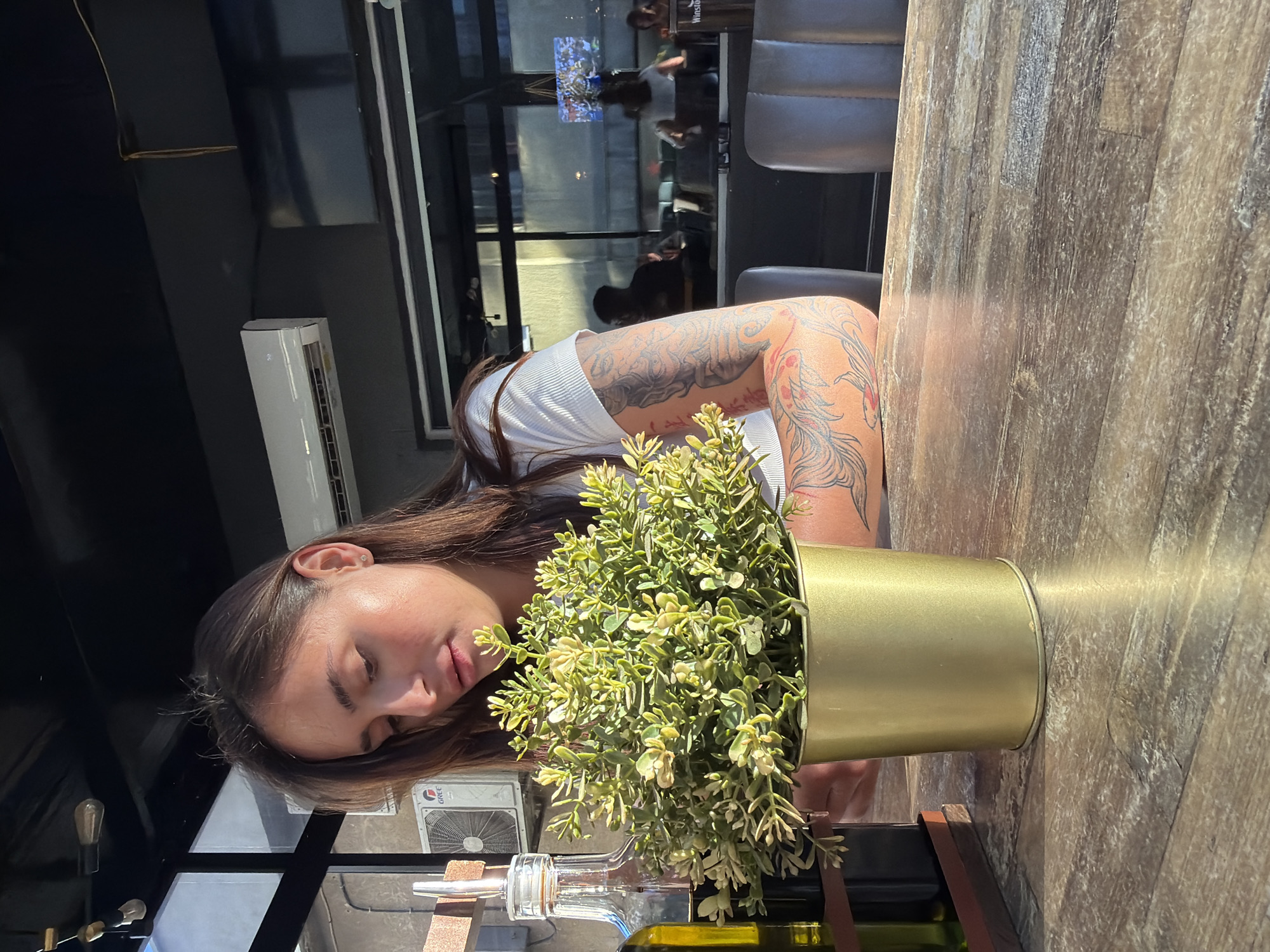 A medium-angle shot shows a woman at a restaurant table in what could be Pernik, Bulgaria. Her face is close to a potted plant in a gold-colored container. The woman has long brown hair, and a visible tattoo on her left arm. She is wearing a white ribbed tank top. A glass bottle is next to the plant. The table has a wood-grain surface. Behind the woman, chairs are seen through a window.