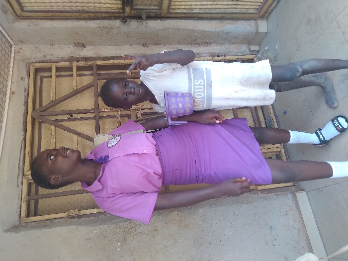 Two young women pose outside a building with a security gate. One woman wears a pink uniform dress and white socks. She looks upward and to the side, smiling. The other woman wears a white t-shirt with "FAMOUS" on it, along with what looks like dark leggings and a pair of black and white sandals. She holds a small purple handbag. She looks at the camera and makes a peace sign with her fingers. Both girls appear to be standing next to a concrete wall, with a steel security gate in the background.