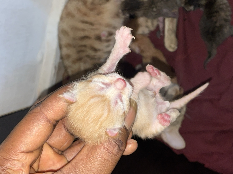 The image depicts an indoor scene in Akwanga, Nigeria. A dark-skinned human hand is centrally positioned, gently holding a newborn, light orange kitten with faint tabby stripes. The kitten's eyes are closed, its nose and paw pads are pink, and a small umbilical stump is visible on its belly. Its front paws are extended with tiny claws. In the soft-focus background, a larger, light brown tabby cat, likely the mother, with visible nipples, rests on a dark red fabric. Several other kittens, some dark-colored and others lighter, are also visible, resting on the same red fabric. A white wall is partially visible in the upper background.